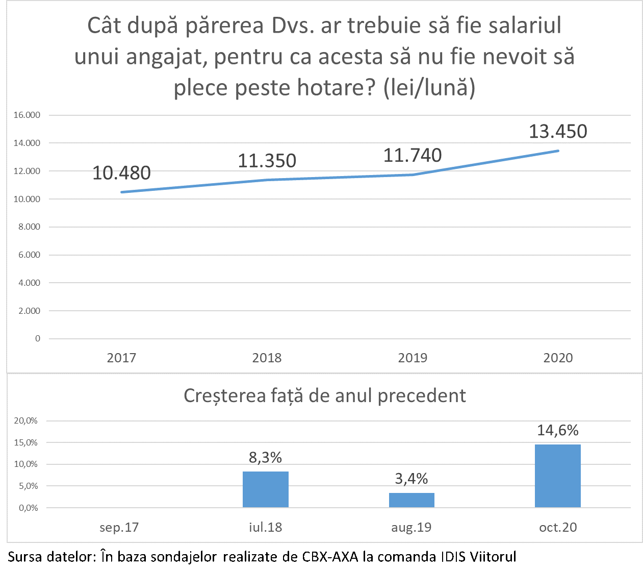 Salariul mediu acceptat în acest an pentru a nu emigra din ţară este cu 14,6% sau 1710 lei/lunar mai mult decât anul trecut. Este cea mai mare creştere din toţi cei 4 ani de când IDIS „Viitorul” realizează astfel de sondaje.