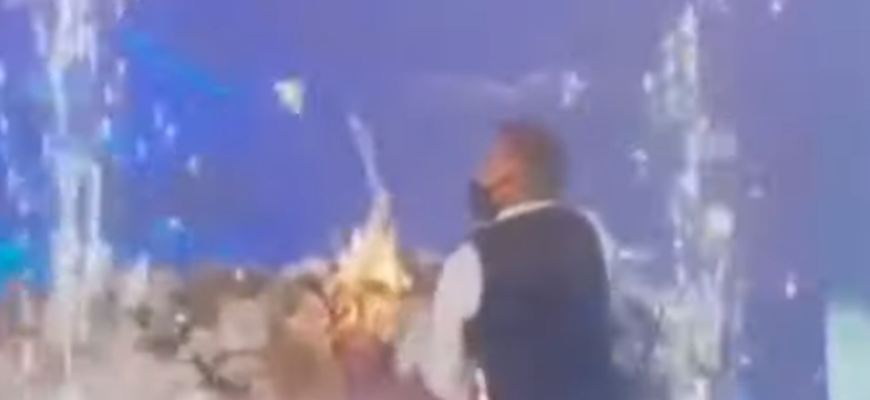 O masă de la o nuntă, decorată cu flori artificiale și focuri de artificii s-a aprins, în timp ce mirele și mireasa își prezintă primul lor dans. Imaginile au fost publicate rețelele de socializare, iar potrivit autorului postării, incidentul s-a produs recent, într-un cunoscut local dintr-o suburbie a Chișinăului.