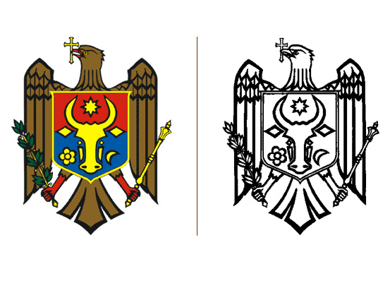 „Stema Republicii Moldova reprezintă un scut pătrat, tăiat pe orizontală, având în partea superioară cromatică roșie, iar în partea inferioară – albastră – cu capul de bour, cu o stea cu 5 raze între coarne. În partea de jos a scutului, pe fundalul albastru, capul de bour este flancat în partea dreaptă de o roză cu cinci petale, iar în stânga de o lună crai-nou. Toate elementele de pe scut sunt de culoare galbenă. Acest ancromatic evocă culorile Drapelului de Stat – Tricolorul. Acvila poartă în gură o cruce de aur și ține în gheara dreaptă o ramură verde de măslin, iar în cea stângă un sceptru de aur.