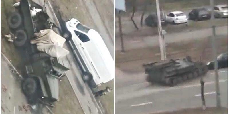 Noi imagini au apărut pe rețelele de socializare cu momentele dramatice de vineri dimineață de pe străzile Kievului. Forțele rusești au fost angajate în lupte și neutralizate în momentul când au intrat în oraș, în timp ce un blindat rusesc trece peste o mașină civilă în trafic.