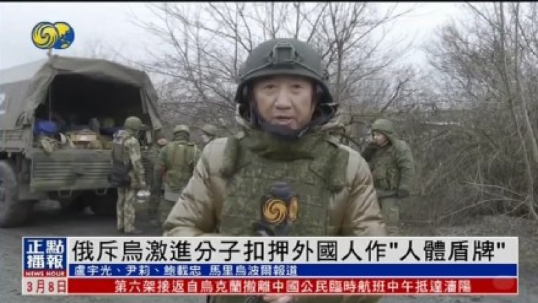 Cu jachetă și cască, reporterul chinez Lu Yuguang stă pe marginea unui drum, în timp ce un tanc rusesc trece pe lângă el. „Sunt în prima linie în Mariupol”, spune Yuguang, ținând microfonul în mână.