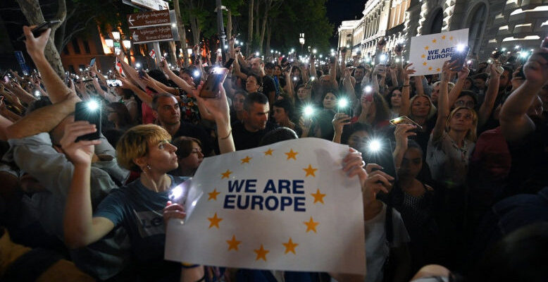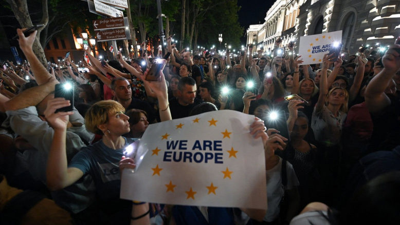În cursul serii, peste 35.000 de manifestanţi s-au adunat în faţa parlamentului georgian, blocând circulaţia pe principala arteră din capitală şi fluturând drapeluri europene şi georgiene, precum şi pancarte pe care scria „Noi suntem Europa”, potrivit unor corespondenţi ai agenţiei France Presse, transmite Digi24.ro.