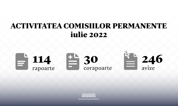 Pe parcursul lunii iulie, comisiile parlamentare permanente au aprobat 114 rapoarte și 30 de corapoarte. În aceeași perioadă, la ședințele comisiilor, au fost avizate 246 de proiecte.