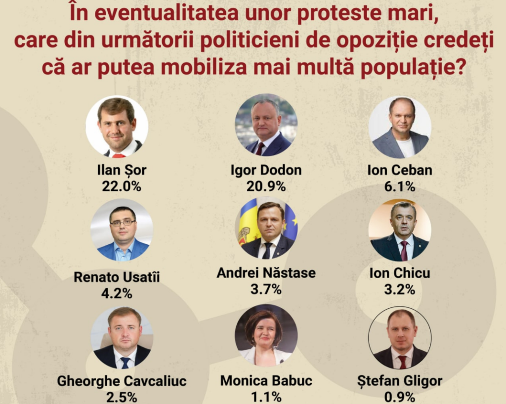 Conform sondajului, 22% dintre participanții la acest studiu susțin că Ilan Șor este politicianul care ar scoate în stradă cei mai mulți oameni pentru a protesta. El este urmat de socialistul Igor Dodon, precum și de colegul acestuia – primarul capitalei, Ion Ceban.