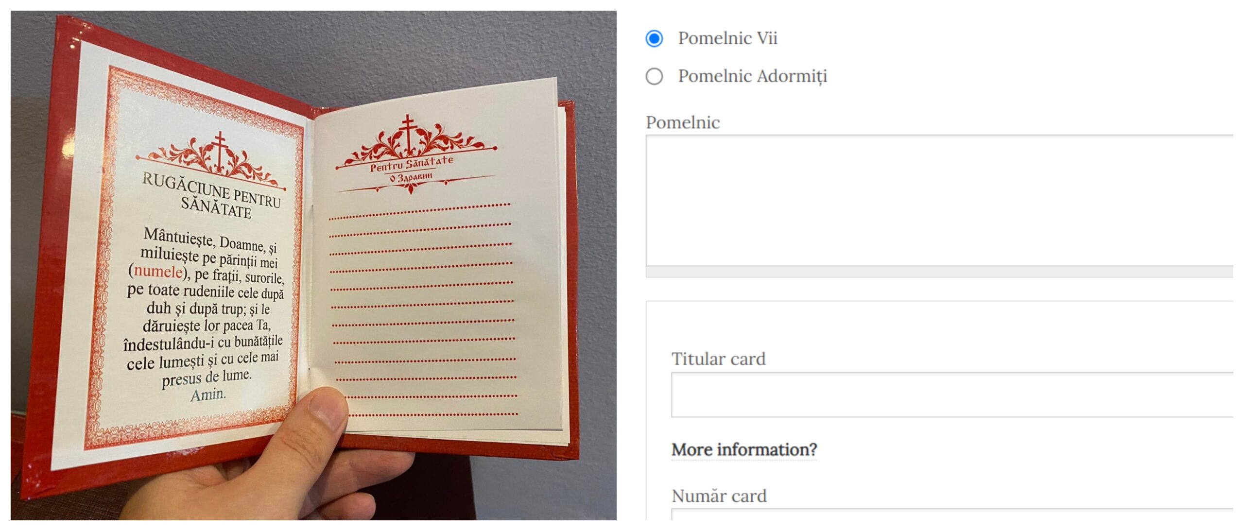Prima dată, trebuie să treacă într-un chenar suma pe care doresc să o doneze, tipul pomelnicului, apoi lista cu numele celor care trebuie pomeniți de preoți. Înainte de a apăsa butonul „trimite pomelnic”, trebuie introduse și datele cardului.