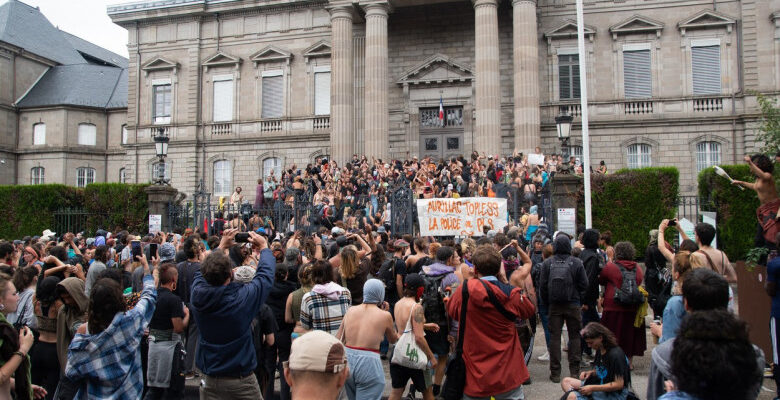Într-o atmosferă iniţial relaxată, protestatarii au străbătut sâmbătă după-amiază străzile din centrul oraşului Aurillac. Înregistrări video distribuite pe reţeaua de socializare X îi arată pe manifestanţi scandând sloganuri feministe, precum şi împotriva Poliţiei. Ajunsă în faţa Palatului de Justiţie, mulţimea a început să aplaude în grup.