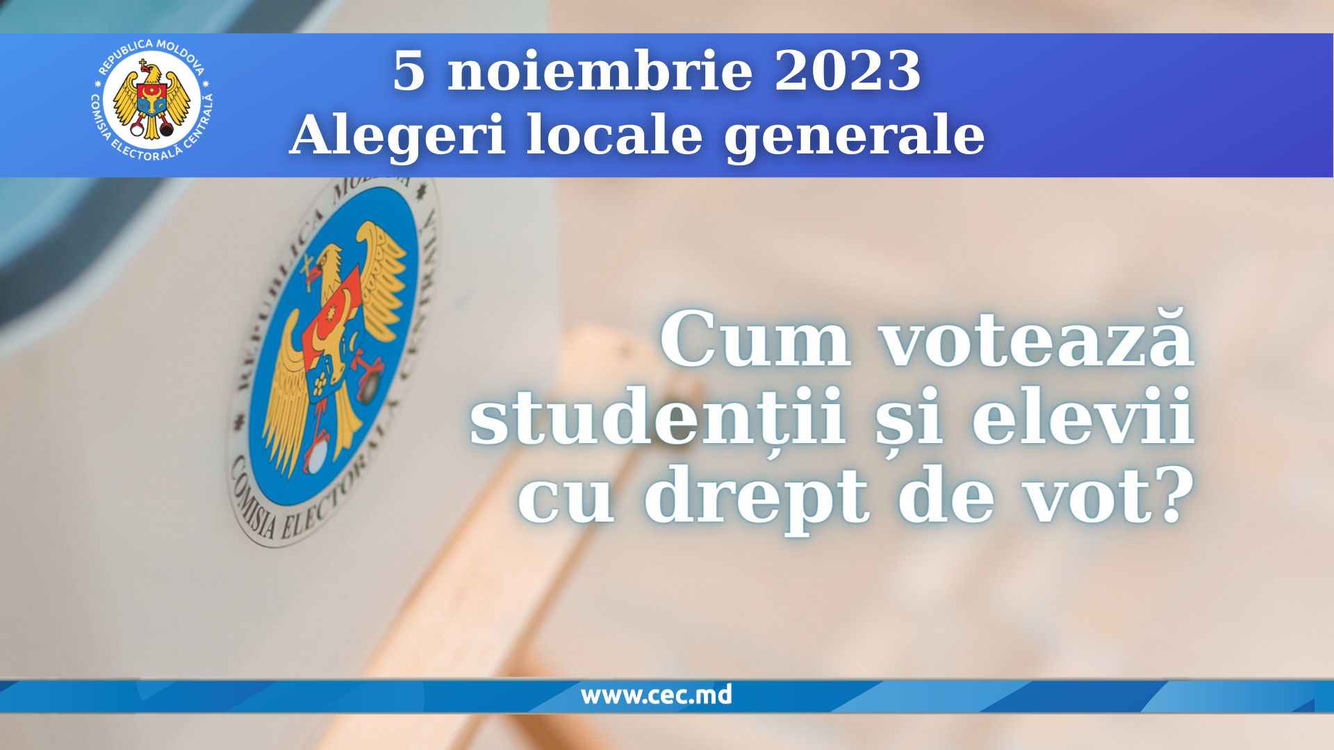 Comisia Electorală Centrală anunță că studenții și elevii cu drept de vot, înmatriculați la instituții de învățământ în localitatea în care au înregistrare la domiciliu sau la reședința temporară de mai puțin de 3 luni până la data primului tur de scrutin, vor putea să participe la alegerile locale generale din 5 noiembrie 2023.
