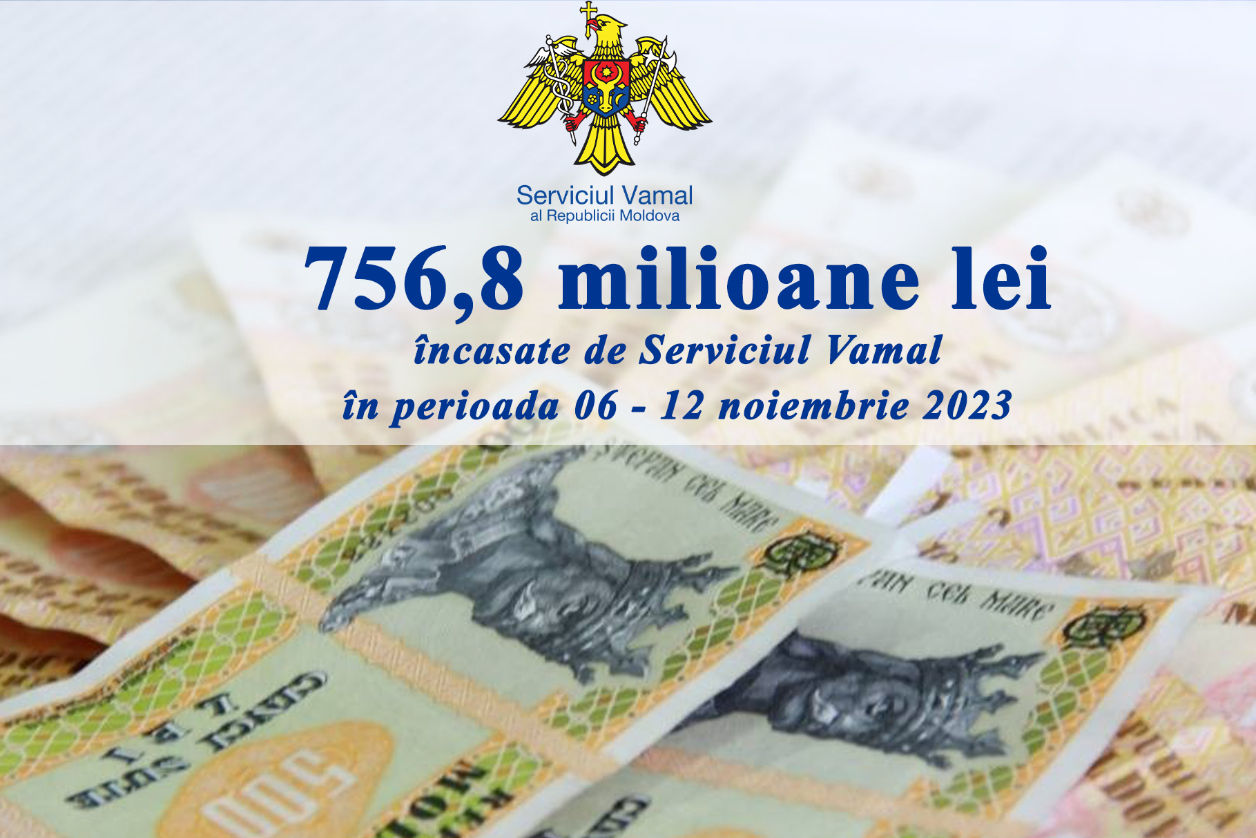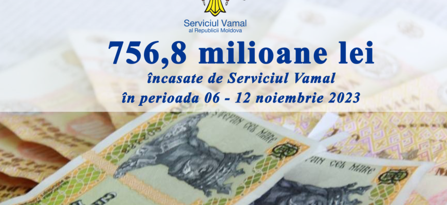 În perioada 06 – 12 noiembrie 2023, încasările Serviciului Vamal la bugetul de stat se ridică la peste 756,8 milioane de lei, iar de la începutul anului curent, Serviciul Vamal a colectat la bugetul de stat circa 29,7 miliarde lei, fiind atestată o creștere de 3,5 % față de încasările din intervalul corespondent al anului 2022.