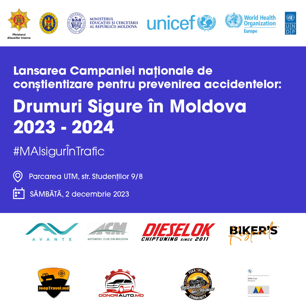 În cele 11 luni ale anului curent, 168 de persoane și-au pierdut viața, iar altele 1.915 persoane s-au ales cu diferite traumatisme. Acest bilanț face necesară intervenția noastră pentru prevenirea acestor accidente. Este momentul ca, împreună să reducem aceste fenomene, prin informarea participanților la trafic în legătură cu pericolele pe care le aduc încălcările regulilor de circulație rutieră. Inițiativa Ministerului Afacerilor Interne de creșterea conștientizării populației, „Drumuri Sigure în Moldova 2023 – 2024, #MAI sigur în trafic” este susținută de Cancelaria de Stat, Ministerul Educației și Cercetării, având ca parteneri UNICEF Moldova, OMS Regiunea Europeană, UNDP Moldova, DieselOk, Biker’s Respect, BMW Club Moldova, JeepTravel, DonorAuto.md, Poka2ski MD, Automobil Club din Moldova și Avante.