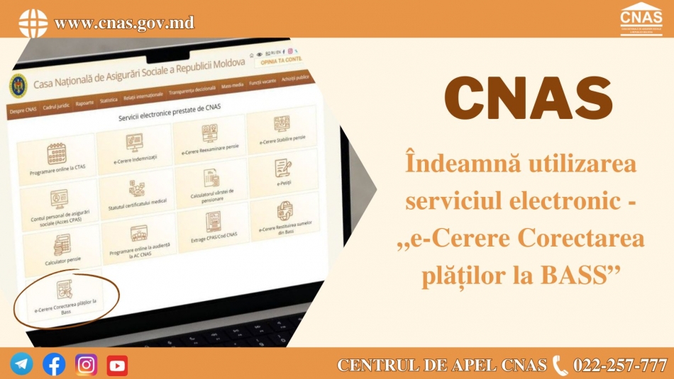 Casa Națională de Asigurări Sociale implementează continuu servicii electronice, destinate să economisească timpul și resursele beneficiarilor. În acest sens, a fost introdus un nou serviciu public electronic: „e-Cerere Corectarea plăților la BASS”.