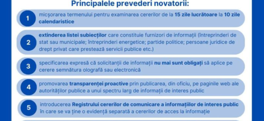 micșorarea semnificativă a termenului pentru examinarea cererilor de la 15 zile lucrătoare la 10 zile calendaristice, cu posibilitatea extinderii cu cel mult 7 zile calendaristice în cazul în care cererea este complexă sau se solicită un volum mare de informații și impune timp suplimentar pentru prelucrare (anterior, legea prevedea extinderea cu 5 zile lucrătoare);extinderea listei subiecților care constituie furnizori de informații, fiind incluse: