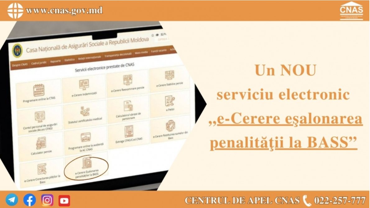 Casa Națională de Asigurări Sociale implementează continuu servicii electronice, destinate să economisească timpul şi resursele participanților la sistemul public de asigurări sociale. În acest scop, a implementat pentru plătitori de contribuții la bugetul asigurărilor sociale de stat serviciul public electronic „e-Cerere Eşalonarea penalităţii la BASS ”.