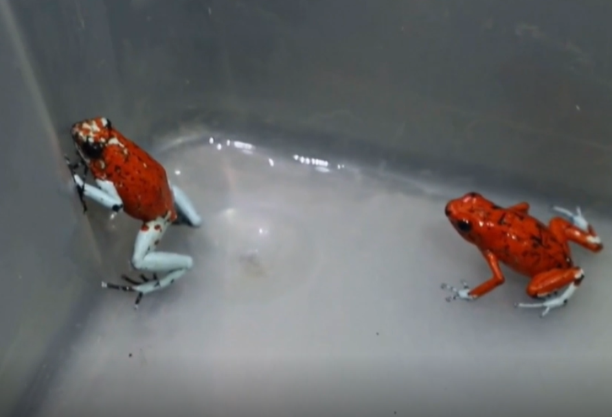 Broscuțele, identificate ca fiind specia Oophaga histrionica, cunoscute și sub numele de broaște arlecchino sau broaște cu dard otrăvit, sunt de dimensiuni mici, mai puțin de mărimea unui deget uman, dar sunt extrem de periculoase datorită glandelor lor de pe piele care produc o otravă puternică.