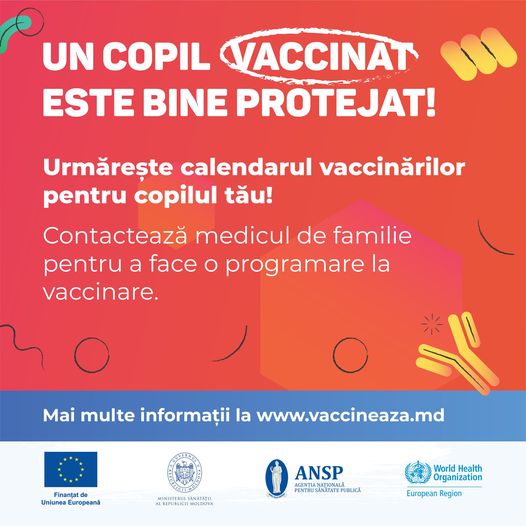 Reamintim, că în Republica Moldova acoperirea vaccinală în ultimii ani are o tendință de scădere. În acest context, toți părinții sunt îndemnați să revadă vaccinările copiilor conform Calendarului de vaccinare, iar în cazul lipsei vaccinărilor să se adreseze la medicul de familie pentru a obține informații despre importanța imunizărilor și să vaccineze copiii.
