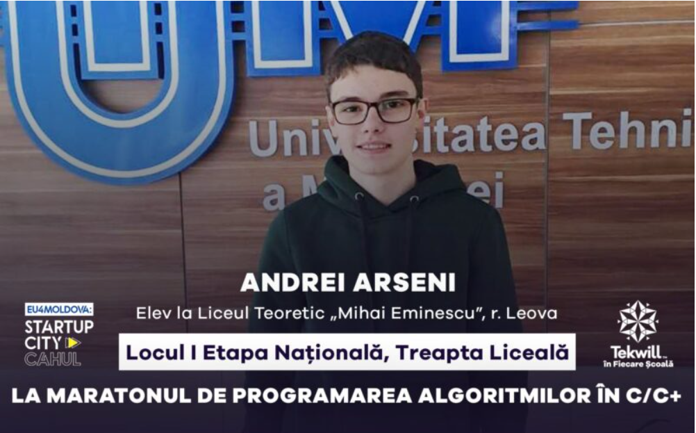 Maratonul de Programarea Algoritmilor în C/C++ a avut loc pe 27 ianuarie. Competiția a fost organizată de Proiectul „Tekwill în Fiecare Școală” în parteneriat cu Ministerul Educației și Cercetării al Republicii Moldova și Universitatea Tehnică a Moldovei, cu sprijinul financiar oferit de Delegația Uniunii Europene în Republica Moldova și Suedia.