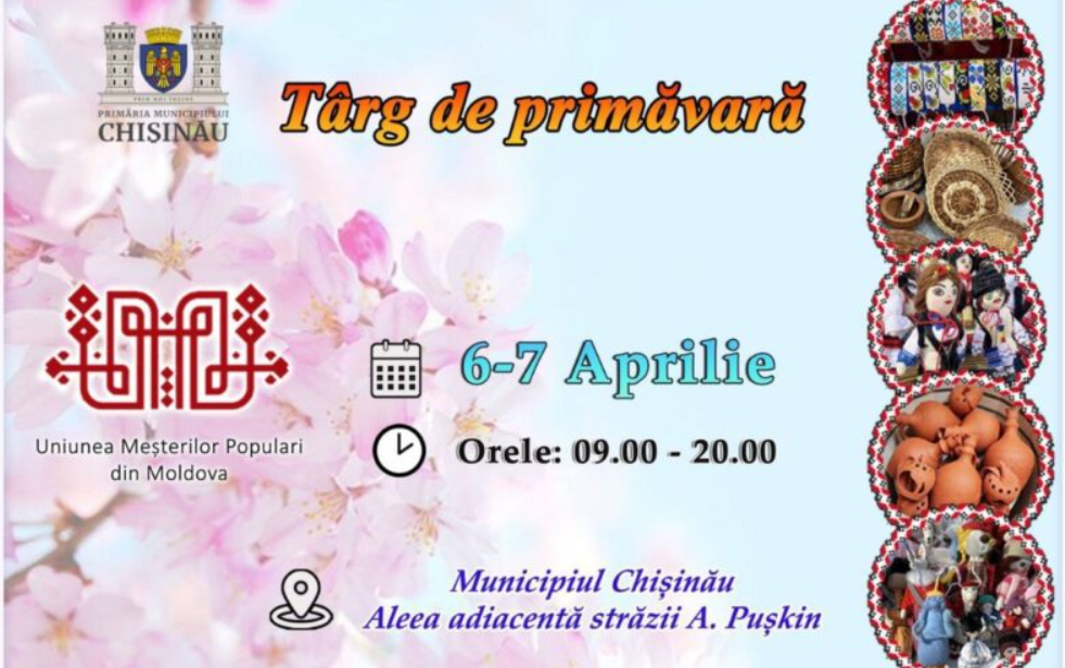În Scuarul Catedralei Mitropolitane „Nașterea Domnului” – pe aleea adiacentă str. Al. Pușkin, în perioada 06-07 aprilie 2024 (09:00-20:00) – Târg de Primăvară, cu articole meșteșugărești și de artizanat, organizator: AO „Uniunea Meșterilor Populari din Moldova”.