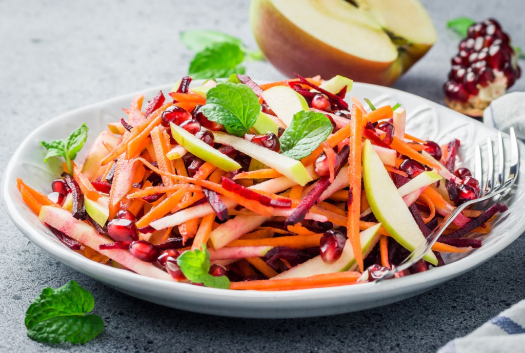 Pentru prepararea salatei, după ce ați amestecat morcovii, țelina, sfecla și mărul rase, adăugați un pic de sare, suc de lămâie și ulei de măsline. La final, puteți presăra pe salata pusă în farfurie o linguriță de semințe de susan alb.