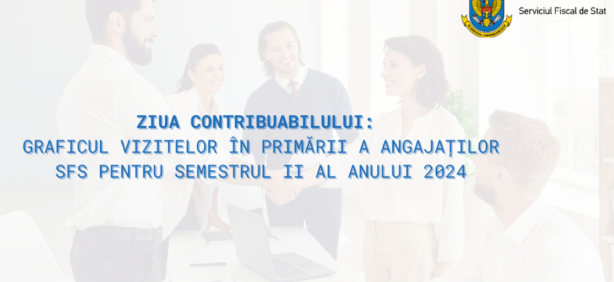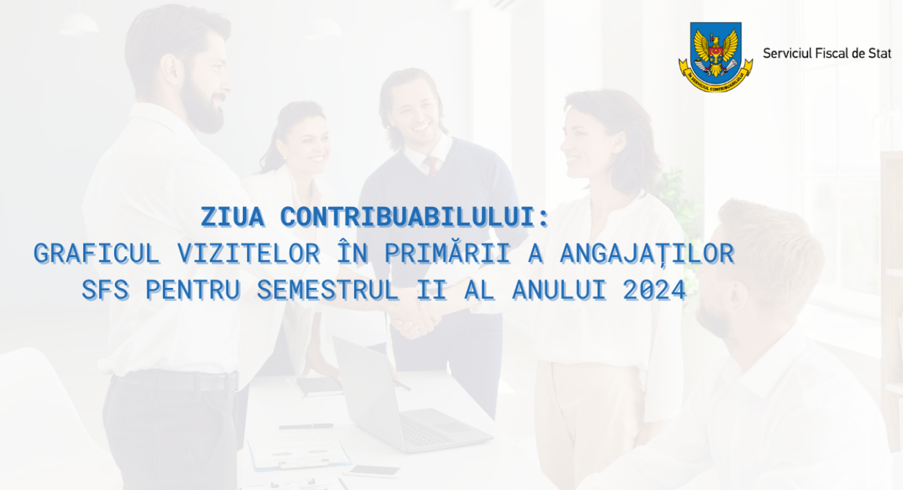Angajații Serviciului Fiscal de Stat continuă vizitele în localitățile din toată țara în vederea consultării și deservirii contribuabililor. Graficul vizitelor pentru semestru II al anului 2024 a fost publicat pe pagina-web și pot fi consultat aici.