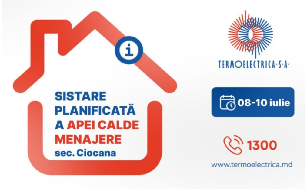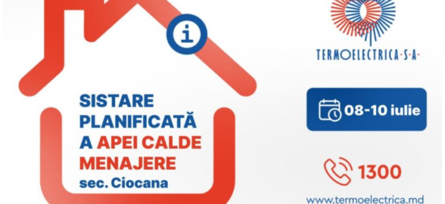 Termoelectrica S.A. informează consumatorii despre sistarea temporară a apei calde menajere pentru 8 -10 iulie curent.