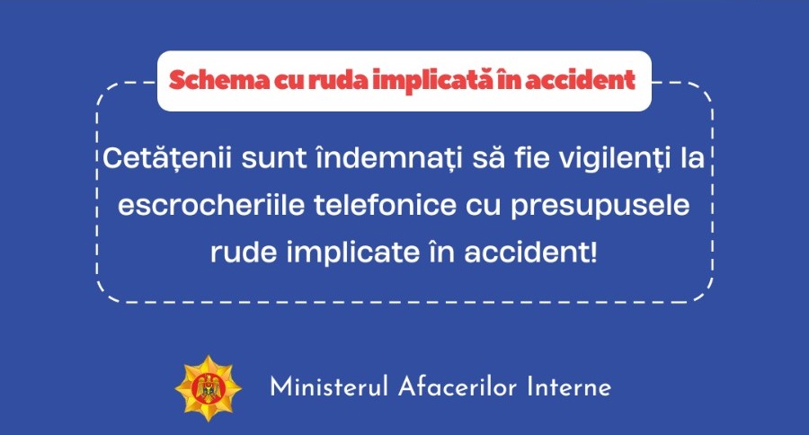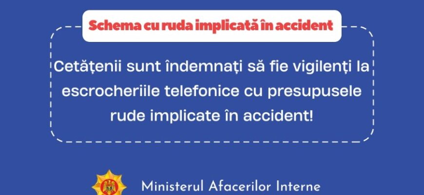 Ministerul Afacerilor Interne informează despre faptul că Poliția Națională a luat măsuri imediate pentru a preveni propagarea schemei de escrocherie „ruda implicată în accident rutier”.