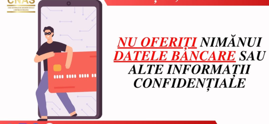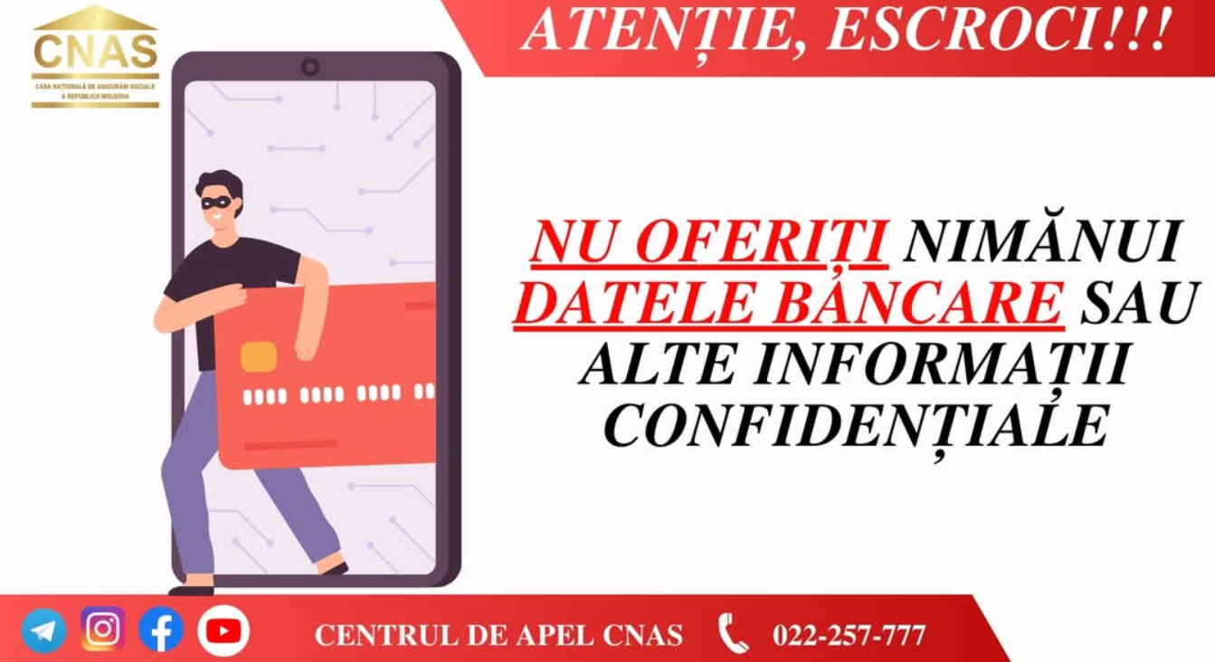 Casa Națională de Asigurări Sociale (CNAS) informează că NU contactează beneficiarii prin telefon pentru a solicita date bancare. Plata prestațiilor sociale se face exclusiv prin serviciul guvernamental de plăți MPay, fără a fi necesar să oferiți informații despre cardul bancar.