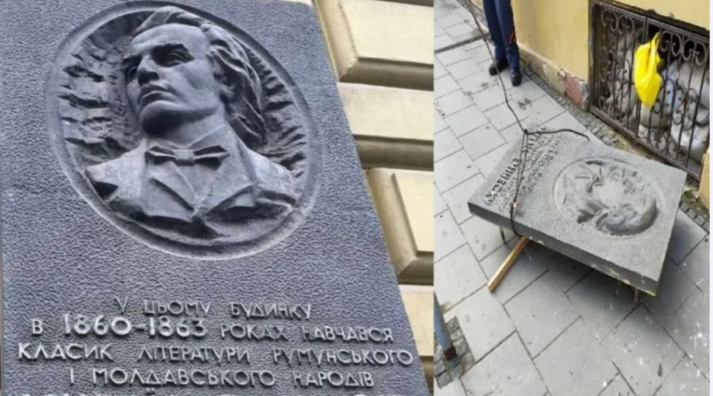 Placa memorială cu basorelieful poetului Mihai Eminescu, aflată pe fațada clădirii de pe strada Ivan Franko nr. 1 din Cernăuți (fosta clădire a Obergymnasiumului), a fost demontată temporar, potrivit unui anunț al Consiliului Local Cernăuți, scrie BucPress.
