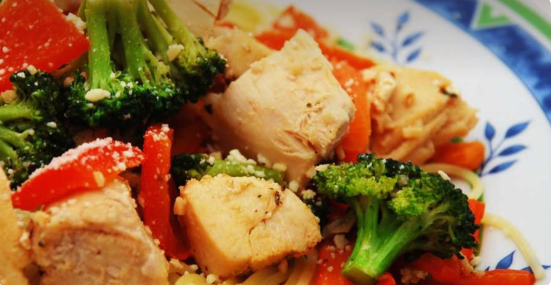 Piept de pui la grătar (150 g) cu garnitură de quinoa (100 g gătită) și broccoli aburit (200 g), asezonat cu suc de lămâie și 1 linguriță ulei de măsline.