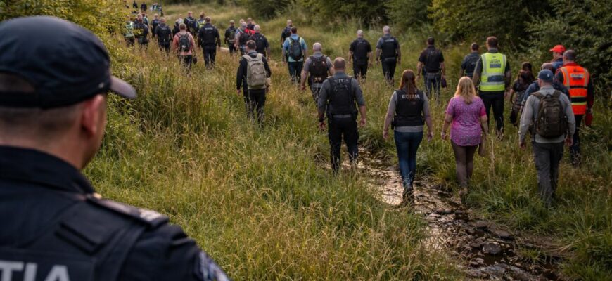 La căutări participă polițiști, pompieri, jandarmi, echipe Salvamont, câini de urmă și voluntari din comunitate.